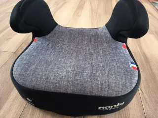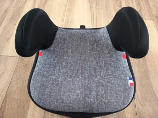 Elevador con sistema de anclaje Isofix. Diseñado para ofrecer comodidad y seguridad. - Tapicería gris con detalles en negro.