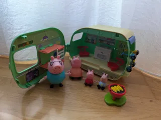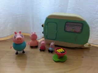 Caravana de Peppa Pig con varios accesorios y figuras. - Caravana desplegable con interior detallado. - Incluye figuras de la familia Pig. - Accesorios como barbacoa y sillas.