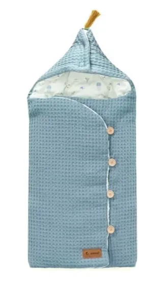 Saco de la marca Jane, modelo Mins, diseñado para capazo. Presenta un tejido exterior texturizado en color azul. - NUEVO (sin estrenar) - Cierre con botones de madera. - Detalle de borla en la capucha. - Etiqueta de la marca visible en la parte inferior.