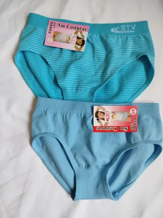 Pack de 2 braguitas para niña, talla 6/8 años. - Una braguita azul con rayas blancas finas. - Una braguita azul lisa. - Marca STV. - Modelo Sin Costuras. Con etiqueta, sin estrenar.