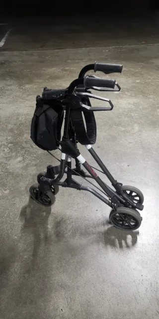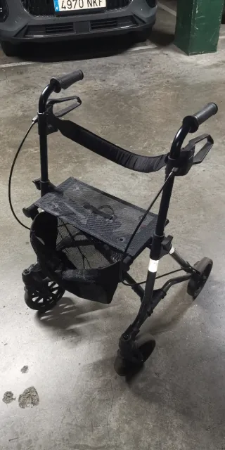 Andador versátil 2 en 1, que funciona como silla de paseo y andador. - Estructura metálica negra. - Asiento transpirable y respaldo acolchado. - Cesta de almacenamiento. - Ruedas para facilitar el movimiento.