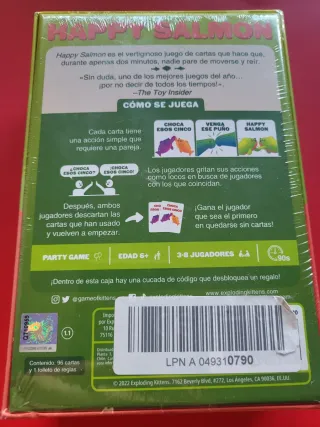 Juego de cartas Happy Salmon de Exploding Kittens. Un juego rápido y divertido para toda la familia. - Duración aproximada de 90 segundos por partida. - Ideal para 3-8 jugadores. - Edad recomendada: 6+ años. PRECINTADO