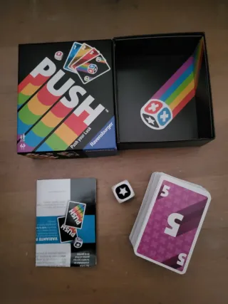 Juego de mesa Push de Ravensburger, ideal para partidas rápidas y divertidas. - Diseño colorido y atractivo. - Incluye dados y cartas. - Para 2-6 jugadores. - Edad recomendada: 8-99 años.
