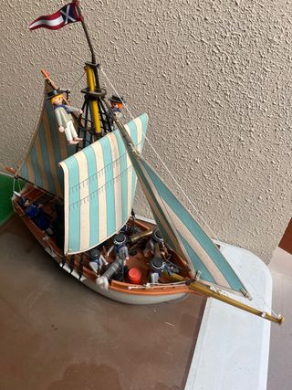 Barco goleta de Playmobil, referencia 6348. Un clásico para coleccionistas y amantes de los barcos. - Incluye figuras de piratas y marineros. - Velas a rayas azules y blancas. - Cañones y accesorios. - Mástil con bandera.