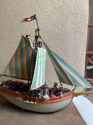 Fantástica goleta de Playmobil con tripulación. - Barco de vela con mástil y velas a rayas. - Incluye varias figuras de marineros con uniformes. - Accesorios de juego.