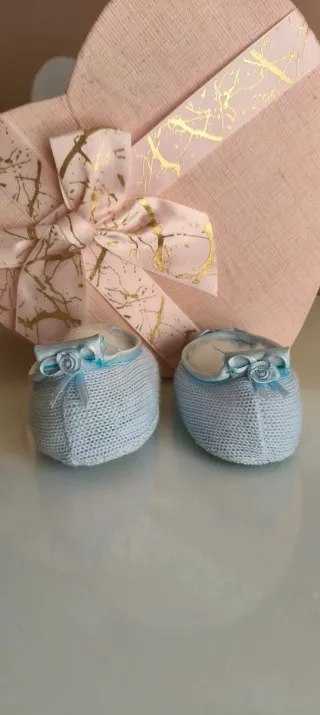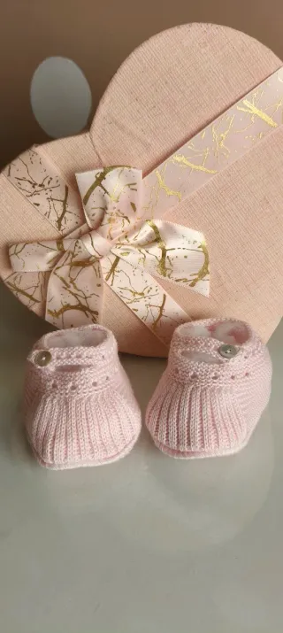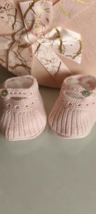 Preciosos patucos de bebé hechos a mano, perfectos para recién nacidos. - Color rosa suave. - Tejido de punto. - Adornados con un delicado lazo blanco.
