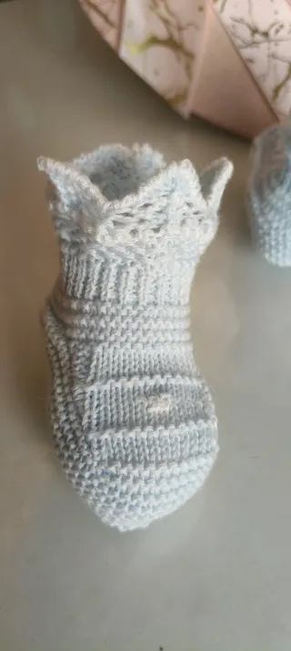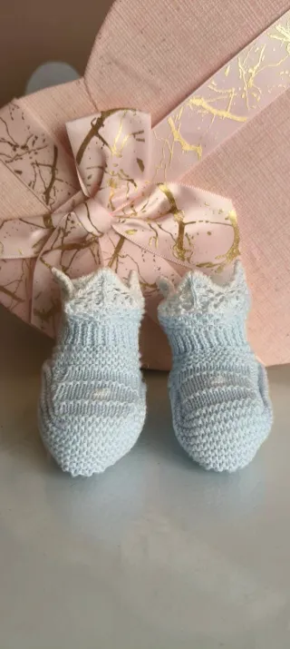 Preciosos patucos de bebé hechos a mano, perfectos para mantener los pies calentitos. Son de un suave color azul y tienen un diseño delicado. - Tejido de punto. - Color azul claro. - Detalle de encaje en el borde.
