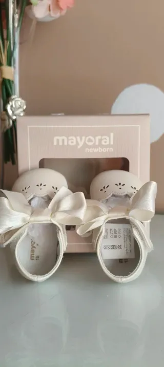 Preciosos zapatos de vestir para bebé o niña, perfectos para ocasiones especiales. Tienen un diseño delicado y elegante. - Color blanco roto. - Adorno de lazo de satén. - Detalle de picado en la punta. - Suela flexible.