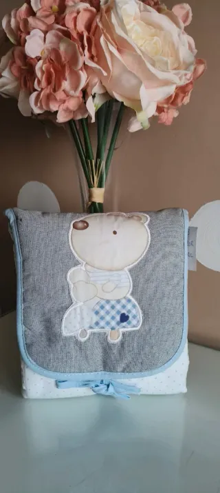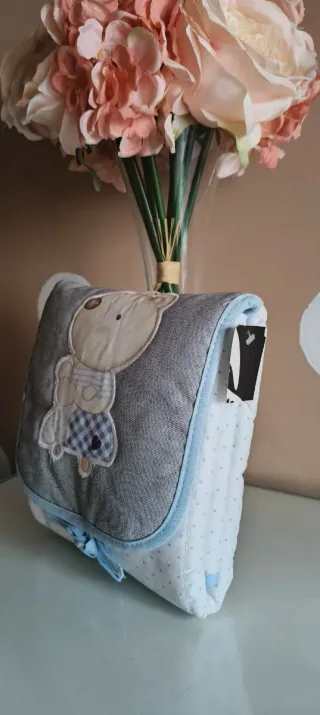 Cambiador de bebé con un tierno diseño de osito. - Tejido principal gris con detalles de osito. - Parte inferior blanca con topitos azules. - cierre con lazo en color azul. - Aplicación de osito con ropa a cuadros.
