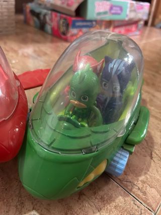 Set de dos naves de los Pj Masks, una roja y otra verde. - Nave roja con figuras, en su interior. - Nave verde con figuras de Gatuno, Gekko y Buhita.