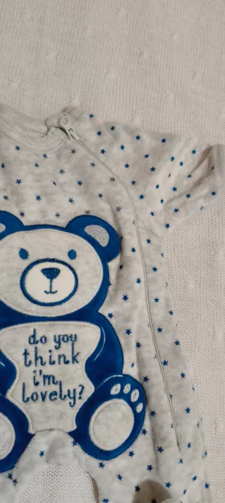 Pijama de una pieza para recién nacidos prematuros con un tierno diseño de oso. - Estampado de estrellas azules sobre fondo gris claro. - Detalle de oso azul con texto do you think i'm lovely?. - Cierre de botones a presión en la parte del pañal y cremallera.