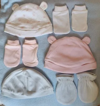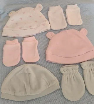 Conjunto de gorro y manoplas para recién nacido en 100% algodón sin estrenar. 2 € la unidad. - Gorro blanco con estampado de mariposas con orejitas y a juego manoplas blancas. - Gorro rosa con orejitas y a juego manoplas rosas. - Gorro azul claro con manoplas a juego.