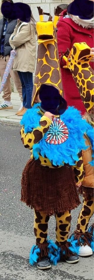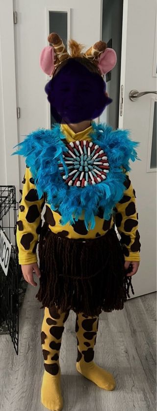 Disfraz de jirafa hecho a mano, ideal para fiestas o Halloween. Talla 3-5 - Incluye cabeza alta de girafa , diadema con orejas y cuernos. - Cuerpo de jirafa con manchas. - Collar de plumas azules. - Falda de lana marrón. - Medias con estampado de jirafa. - Cubre pies de lana y plumas Toda laropa es termica y calentita