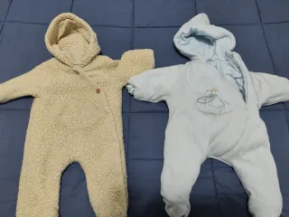 Conjunto de dos buzos para bebé, perfectos para mantenerlos abrigados. - Buzo de peluche color crema con forro interior. - Buzo de canalé azul claro con bordado. - Cierre frontal con botones en el buzo de peluche. - Capuchas incorporadas en ambos buzos. Talla de 1 a 3 meses. Super cómodos y calentitos. En perfecta condiciones, usados muy poco.