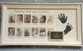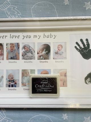 Marco para crear un recuerdo inolvidable de tu bebé. Incluye todo lo necesario para capturar sus huellas. - Marco de fotos para 12 imágenes mensuales. - Espacio para huella de mano y pie. - Almohadilla de tinta incluida.
