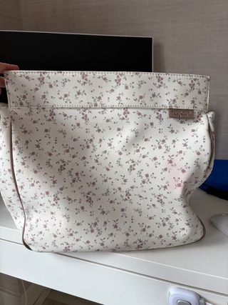 Bolso de bebé con un bonito estampado floral. No tengo correa mas larga, es para colgar del carro - Diseño con flores en tonos rosas y base blanca. - Acabado en polipiel. - Detalle de etiqueta de marca.