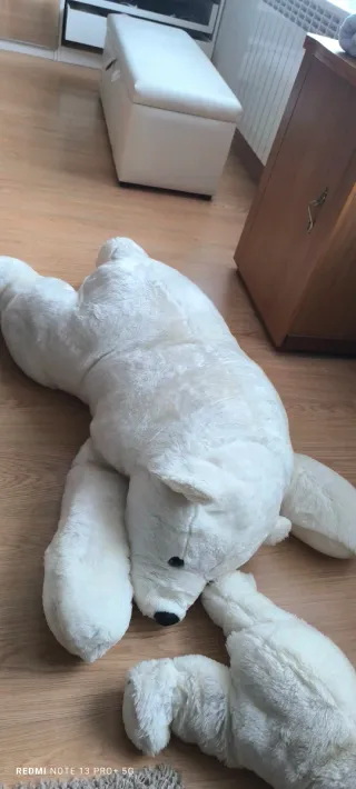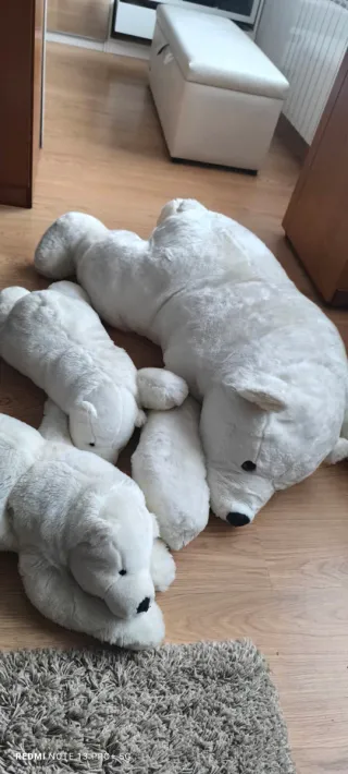Conjunto de 3 peluches de osos polares blancos, perfectos para decorar o para jugar. por separados el grande 250 y cada pequeño 100 si van juntos 375. Se compraron nuevos por 800e para ponerlos en un escaparate - Material suave y tierno. - Diseño de oso polar. - Ideal para todas las edades.
