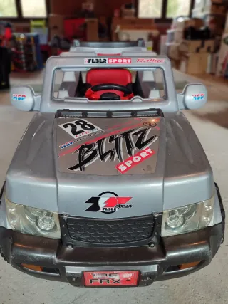 Coche a batería Feber modelo Blitz Sport con diseño deportivo. - Color gris plateado. - Volante rojo. - Detalles de pegatinas Feber Sport Rallye, HSP, 28 GTR-Car HSP Performance, Blitz Sport, 125 FRX. - Parrilla negra. - Faros delanteros transparentes.