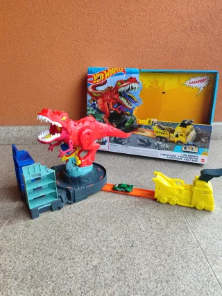 Set de juego Hot Wheels T-Rex - Incluye figura de T-Rex. - Incluye lanzador de coches amarillo. - Incluye coche verde. - Pista de juego.