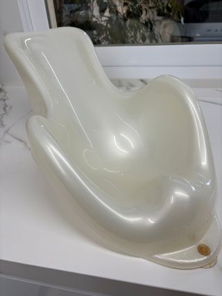 Bañera de plástico para bebés, de color crema. - Asiento interior para mayor comodidad. - Asas laterales para facilitar el transporte. - Diseño con base estable y bordes redondeados.