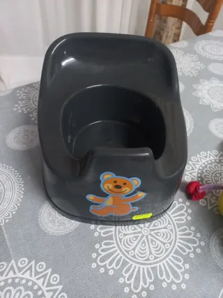 Orinal de bebé en color gris, con un divertido dibujo de oso en la parte frontal. Es un artículo nuevo, ideal para la etapa de aprendizaje. - Diseño ergonómico. - Material plástico resistente. - Adorno de oso. - Color gris. - se regalan los peluches.