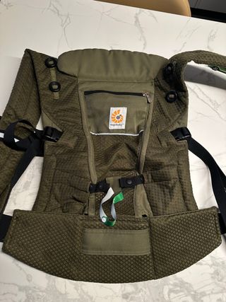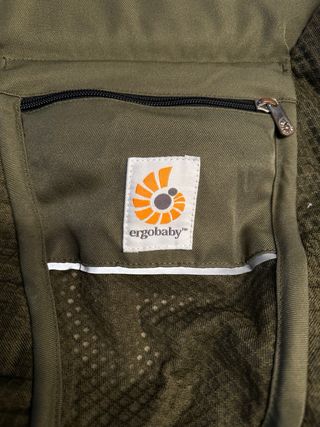 Mochila porta bebés Ergobaby en color verde. Diseñada para llevar al bebé de forma cómoda y segura. - Tejido texturizado. - Bolsillo frontal con cremallera. - Logo de la marca visible.