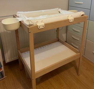 Cambiador de bebé de madera clara, con dos niveles para mayor comodidad. - Estructura de madera. - Dos bandejas. - Diseño sencillo y funcional. - Incluye colchoneta, cubos para dejar productos y colgadores.