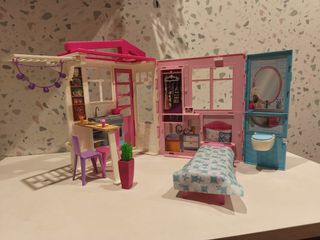Casa de muñecas Barbie plegable, ideal para llevar a todas partes. Se abre para revelar diferentes estancias. - Cocina equipada con barra de desayuno. - Dormitorio con cama. - Baño con inodoro y lavabo. - Accesorios incluidos.