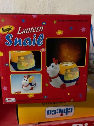 Proyector de luz con forma de caracol, coleccion 1990 - Diseño colorido con caparazón de varias secciones. - Base blanca con detalles rojos. - Antenas rojas y ojos azules.
