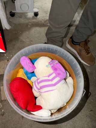 Conjunto de peluches variados. -Doraemon. -el pajaro loco (portaventura) - Peluche blanco con puntos negros y ojos azules. - Peluche blanco con ojos azules.
