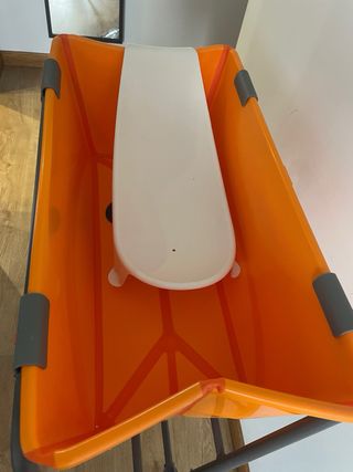 Bañera plegable Stokke Flexi Bath XL en color naranja. Incluye soporte. - Diseño plegable para fácil almacenamiento. - Soporte para recién nacidos incluido. - Materiales duraderos y seguros.