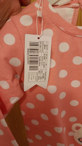 Vestido de bebé con un alegre estampado de lunares y un adorable osito. Marca deno kids Talla 6-12 meses - Color coral con lunares blancos. - Detalle de osito aplicado en la parte delantera. - Mangas largas con volantes. - Bajo con volante. - Cierre en la espalda.