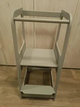 Torre de aprendizaje de color gris, ideal para que los más pequeños alcancen superficies elevadas de forma segura. - Estructura de madera. - Plataforma superior. - Escalón inferior.