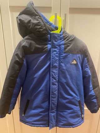Cazadora infantil de color azul y negro, ideal para el frío. - Capucha integrada. - Cierre de cremallera. - Bolsillos laterales con cremallera.