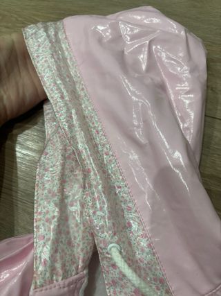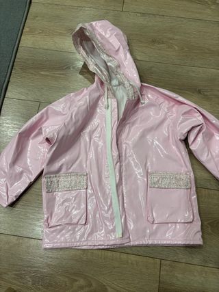 Chubasquero infantil de color rosa brillante, ideal para días de lluvia. Cuenta con un forro interior estampado y bolsillos delanteros. Cierre de cremallera. Capucha con cordón. Talla 2 años. Esta en buenas condiciones, exceptuando un pequeño enganchon en una de las mangas (se ve en la foto).