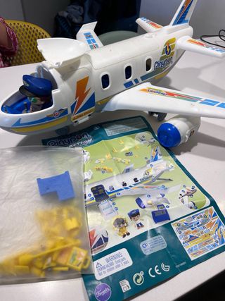 Avión de juguete de Playmobil. - Diseño blanco con detalles de colores. - Alas amplias y cola distintiva.