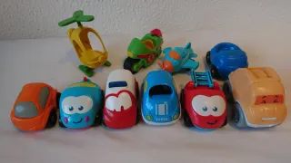 Lote de 10 coches de juguete para bebés. Incluye una variedad de vehículos de diferentes colores y diseños: 7 coches, un helicóptero, una avioneta y una moto de Playmobil. - Helicóptero amarillo y verde. - Avión azul y naranja. - Coche de carreras verde con el número 1. Precio por todo el lote junto. - Coche de policía blanco y rojo. - Coche naranja. - Coche azul con la palabra CARTOON. - Coche rojo con escalera. - Coche azul. - Coche naranja con ruedas grises. Se incluye la caja para guardarlo todo.