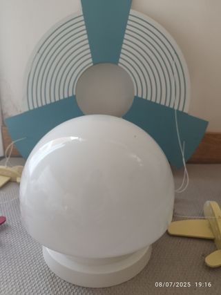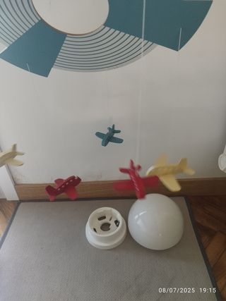 Lámpara infantil con un diseño de aviones colgantes. Ideal para decorar una habitación. Como nuevo lo que ofrezco a falta de comprar una pieza aparte. (Es decir incompleta) Le falta (la tengo pero está rota) la pieza de las ultimas fotos que se puede comprar suelta..(yo la vi en Leroy Merlín) - Aviones de madera en varios colores. - Diseño circular en la parte superior.