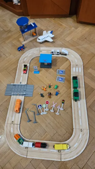 Conjunto de juego de madera que incluye un circuito de tren y elementos de aeropuerto. - Pistas de madera para crear diferentes recorridos. - Torre de control y avión. - Vehículos como coches, camiones y trenes. - Señales de tráfico y figuras. Lo que se ve en las fotos