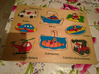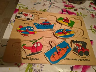 Divertido puzzle de madera con temática de vehículos. - Incluye 8 piezas de diferentes medios de transporte. - Diseños de ambulancia, avión, barco, taxi, canoa, submarino, helicóptero y camión de bomberos. - Ideal para los más pequeños.