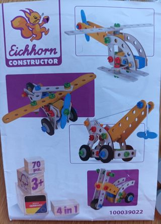 Piezas de construcción marca Eichhorn Constructor 70 piezas de madera para construir diferentes modelos: avión , helicóptero , moto y grúa. Ideal para desarrollar la creatividad y la motricidad fina. Educación Montessori Instrucciones incluidas - Recomendo a partir de 3 años.