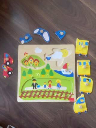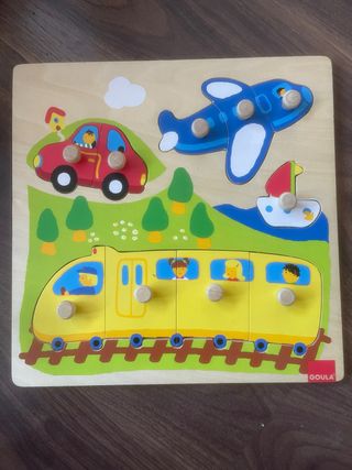 Puzzle de madera Goula con diferentes vehículos para niños a partir de 1 año. Fomenta el desarrollo temprano. - Piezas de madera con agarre. - Ilustraciones de tren, avión, coche y barco. - Base de madera con siluetas. - Marca: Goula. - Higiénico y fácil limpieza acto para niños a partir de año y medio. . Juego educativo que desarrolla la psicomotricidad fina y el pensamiento lógico matemático . Utilizado en centros escolares.