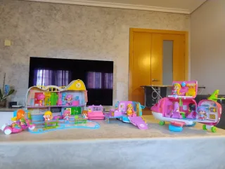 Conjunto de tres juguetes de Pinypon: un avión, un colegio y caravana veterinaria - Avión rosa y blanco con cocina de avion , discoteca en la parte de arriba y cabina de vuelo. Incluye 5 pinypons - Caravana veterinaria con lavadero, cabina y sala de rayos X. Incluye una pinypons y una gato. - Colegio con taquillas, máquina expendedora, despacho y clase con pupitres. Incluye 7 pinypons. En total serían 3 juguetes con 14 pinypons.