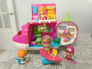 Divertido avión de Pin y Pon con varias figuras y accesorios para horas de juego. - Avión de color rosa y blanco. - Incluye varias figuras de Pin y Pon. - Accesorios como un portátil y una rana.