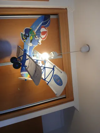 No hago envios Original lámpara de techo con diseño de Mickey Mouse, perfecta para una habitación infantil. Su estructura es de metal azul y las alas son blancas con detalles. - Diseño de avión con Mickey Mouse. - Estructura de metal azul. - Alas blancas con detalles gráficos.