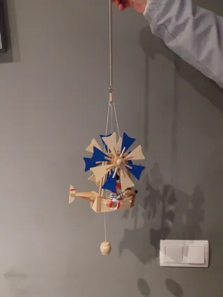 Móvil decorativo de madera con forma de avión y hélice. - Diseño de avión con piloto. - Hélice de madera con detalles azules. - Incluye pesa decorativa en la parte inferior.