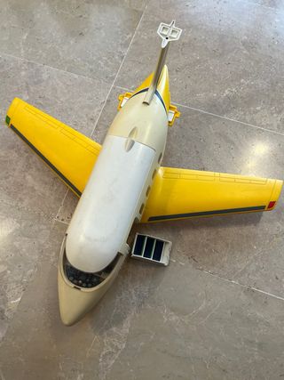 Set de avión de Playmobil con accesorios. - Avión de juguete blanco con detalles amarillos. - Incluye dos figuras de Playmobil (piloto y pasajero). - Accesorios: maleta roja. - Caja original incluida.