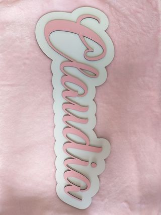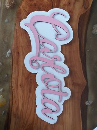 Nombre en madera DM. Personalizado en varios colores y tamaños. El tamaño que se muestra en las fotos es de aproximadamente 42 cm de largo. 20€ con nombre. 25€ con nombre + dibujo