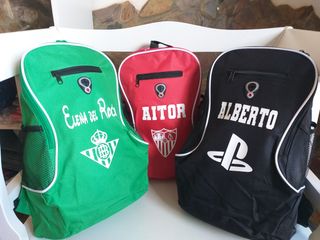 Mochila con el nombre y escudo que quieras. Mide 38x25x12 cm aprox. La mochila puede ser de color; verde, rojo, azul, rosa y negro. Ideal como regalo para cumpleaños, comuniones, excursiones... Más artículos de este estilo en mi perfil y así puedes formar un pack para regalo comunión. Precio por unidad