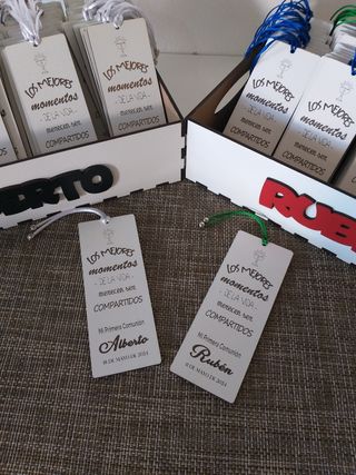 Marcapáginas personalizado con nombre y fecha. Es de madera de DM y mide 13x5centímetros. Ideal para detalle o regalo para los invitados de comuniones, bodas, bautizos, fin de curso... Es una forma original de sustituir a la típica estampita. El precio es por unidad La caja con nombre son 8€. #comunión, boda, bautizo, regalo alumnos, profesores, maestros...